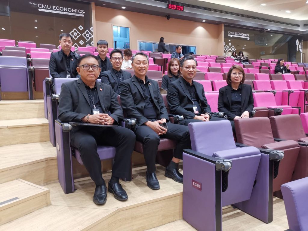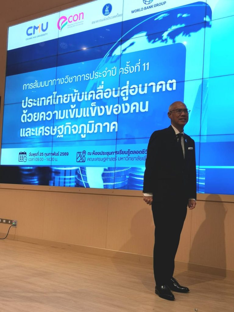 นายธนบดี​ ภู่​สมบุญ​ รองประธาน​ชมรม​ธนาคาร​จังหวัด​เชียงใหม่​ พร้อมด้วย​นาง​สาวพัชรี​พรรณ​ แสง​เนตร​ กรรมการ​ชมรม​ธนาคาร​จังหวัด​เชียงใหม่​ เป็นผู้แทนในนามประธานชมรมธนาคารจังหวัดเชียงใหม่ ร่วม​รับฟังการบรรยายทางวิชาการประจำปี​ ครั้ง​ที่​ 11​ หัวข้อ​”ประ​เทศไทยขับเคลื่อน​สู่อนาคต​ ด้วยความเข้มแข็งของคนและเศรษฐกิจ​ภูมิภาค​ ” จัดโดย​ คณะเศรษฐศาสตร์ มหาวิทยาลัยเชียงใหม่ ร่วมกับธนาคารแห่งประเทศไทย สำนักงานภาคเหนือ และ ธนาคารโลก สำนักงานประเทศไทย เพื่อฉายภาพก้าวต่อไปของอนาคตประเทศไทยสู่การเติบโตอย่างทั่วถึงและยั่งยืน ด้วยการปรับโครงสร้างเศรษฐกิจ ภายใต้ความท้าทายจากบริบทความไม่แน่นอนของเศรษฐกิจโลก ทั้งจากนโยบายการค้าระหว่างประเทศ มาตรการด้านสิ่งแวดล้อมที่กำลังถูกนำมาใช้ ปัจจัยด้านภูมิรัฐศาสตร์ และปัญหาเชิงโครงสร้างภายในประเทศที่สะสมมาเป็นเวลานาน เมื่อวันพุธที่ 25 กุมภาพันธ์ 2569 เวลา 10.00 น. ณ ห้องประชุมการเรียนรู้ตลอดชีวิตอย่างผาสุก คณะเศรษฐศาสตร์ มหาวิทยาลัยเชียงใหม่